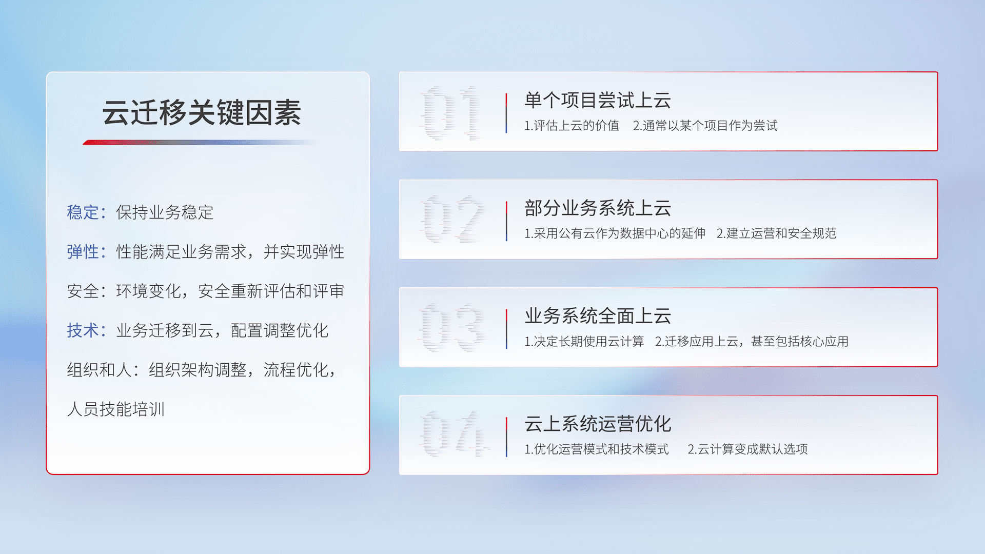 结合实际业务,,,从规划设计、、、云平台选型、、、、云原生改造、、、数据迁移、、集成交付,,,迁移全过程为客户识别最佳上云路径,,,,做好风险识别管理,,,设计网络架构、、、、身份权限、、安全审计合规、、、、操作审计、、、日志审计、、、监控告警策略、、、、多站点容灾设计等,,对云上基础设施进行整体规划,,,,提升IT治理水平,,,以满足弹性、、、、高可用、、高性能的需求。。。。