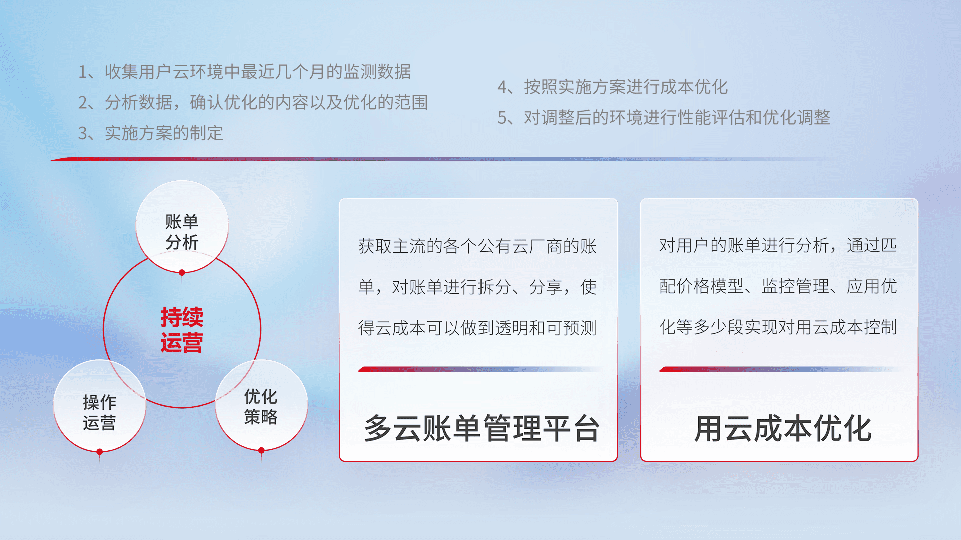 通过多云纳管,,以统一的资源数据模型把客户的云资源进行抽象和封装,,,进而实现对多云资源的统一操作,,保障云资源管理的可靠性、、稳定性与可用性。。。。量身定制化运维内容,,,配置、、开发运维、、、、补丁管理、、、备份、、、监控、、认证和访问管理、、审计和日常巡检等,,,,保障在用云过程中的可靠度,,稳定度以及高可用率。。。。