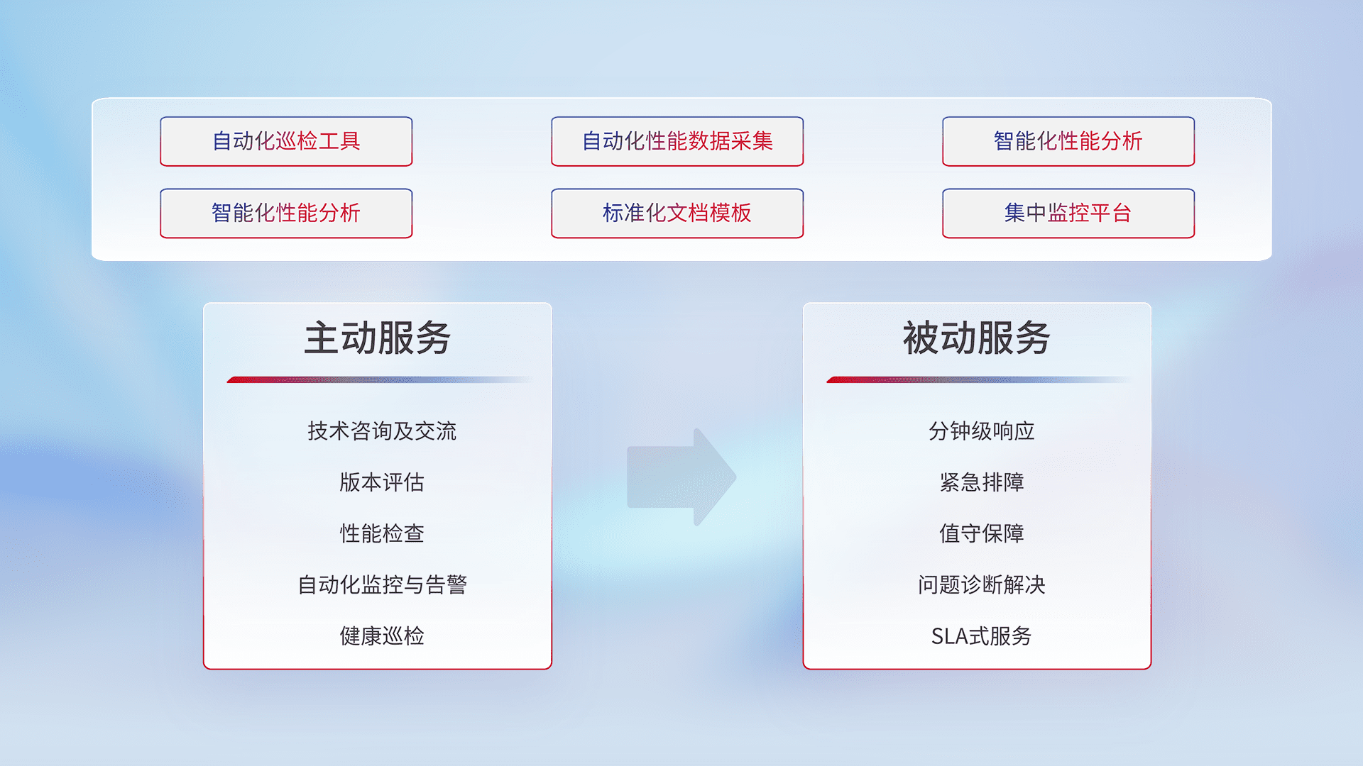 智能化工具和标准化文档,,,保障服务质量,,,,提供主动服务(包含技术咨询、、、、版本评估、、、、性能检查、、自动化监控与告警、、、、健康巡检)和被动服务包含(分钟级响应、、紧急排障、、、值守保障、、、问题诊断解决、、、、SLA服务)。。。